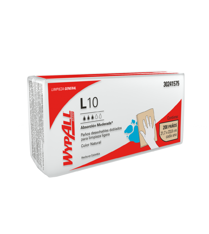 El paño WypAll® L10 desechables recomendado para limpieza ligera y general. Formato doblado en color natural, cada paquete contiene 200 paños. Disposición Final: Una vez usado el paño, la clasificación del tipo de residuo depende del contaminte que se remueve. La disposición final debe de realizarse según la legislación vigente de cada país. Kimberly Clark recomienda la práctica de cero residuos a rellenos sanitarios, realizando un aprovechamiento energético de los mismos, por ejemplo, en CDR (Combustibles Derivados de Residuos). 25 paquetes x 200 paños